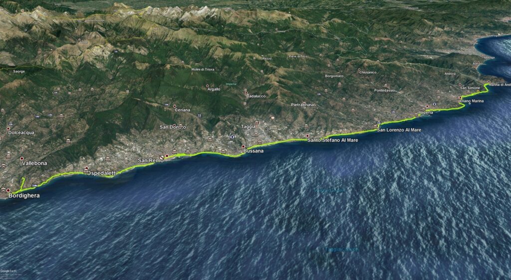 En San Remo tomamos la ‘pista cliclabile della Riviera dei Fiori’ hasta el final de etapa. Esta pista cruza varios túneles iluminados de hasta 2 kilómetros.